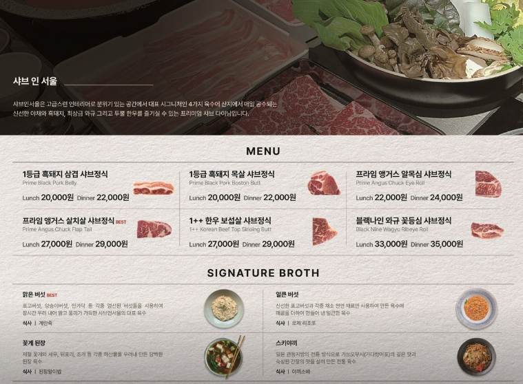샤브인서울은 점심과 저녁 메뉴를 구분하여 제공합니다. 평일 런치에는 좀 더 합리적인 가격으로 즐길 수 있습니다.