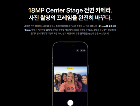 새로운 Center Stage 전면 카메라를 통해 유연한 프레임 전환과 더 스마트한 단체 셀피 촬영이 가능하다.